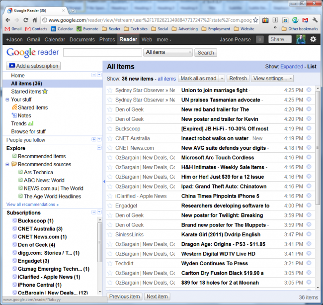Once you have a list of Subscriptions set up, you can click on All Items at the top left of the Reader screen, and you’ll see a list of all new items across all your Subscriptions. (My own interests may be very different from yours as you can see from the diagram!)
