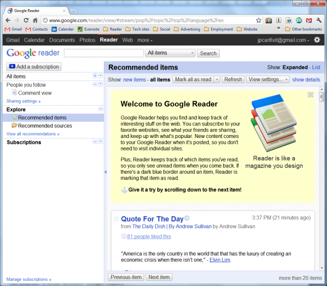 Hope you enjoy Google Reader as much as I do. In the tech world, it really helps me keep up to date with current events. In a computer repair business like mine, sometimes that’s critical!